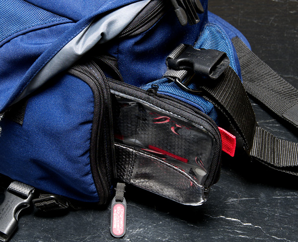 嬉しいのはメモリーカード用のポケットがあり、メモリー用のポーチはゴムベルトでバッグとつながっているところ。SDHCやメモリースティックはケースに入れても紛失する恐怖があり、タムラックのような気配りは安心というか、事故防止に大変有効だ。