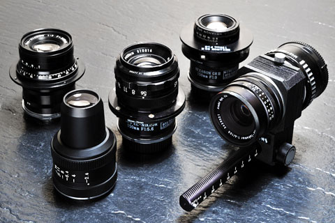 左からOlympus OM System ZUIKO MC MACRO 1:3.5 f=38mm RMS→NIKON-F Mount、EL Nikkor 105mm F5.6、EL Nikkor 50mm F2.8N、EL Nikkor 80mm F5.6、EL Nikkor 50mm F2.8、Fijinon EX 105mm F5.6。