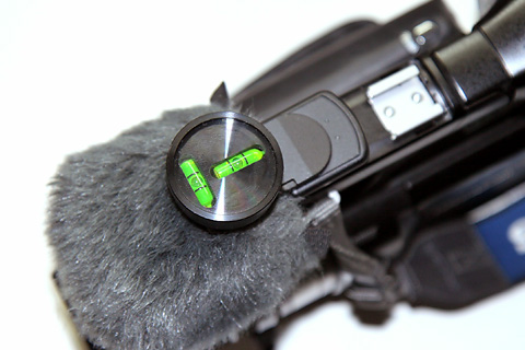 二つあるアクセサリーシューのうち前方のストロボ用に水準器を取り付けた。内臓マイクとのクリアランスは7mmほど取れたので純正ウインドジャマーも問題なく取り付けられた。