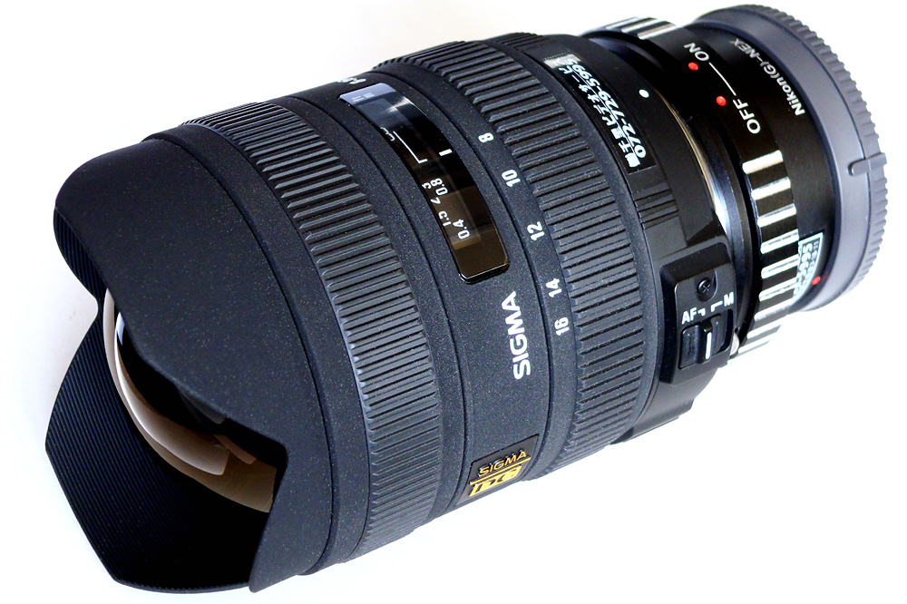 35mmフルサイズ換算12-24mmに相当する画角はかつて世界一の最広角を誇ったニッコール13mmF5.6をもしのぐ画角が得られる。現在フルサイズで12mmの広角といえば同社の12-24mm F4.5-5.6 EX DG ASPHERICAL HSM とフォクトレンデルブランドのウルトラワイドヘリアー12mmF5.6くらいだ。残念ながらウルトラワイドヘリアーは一眼レフ用ではなく、VM(ライカ互換)であり、ともにNEXに装着した場合は画角は1/1.5になってしまう。つまりNEX-Eマウントで使用出来る最広角レンズではこのシグマ 8-16mm F4.5-5.6 DC HSM しか選ぶことが出来ない。