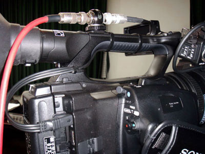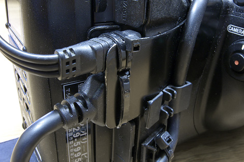 最近はHDMIやHD-SDIへの出力が当たり前になったため、HDMI端子もカメラ側のコネクターを抜き差ししなくても良いように中継コネクターをグリップのバンドに取り付けている。